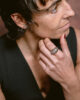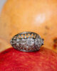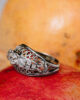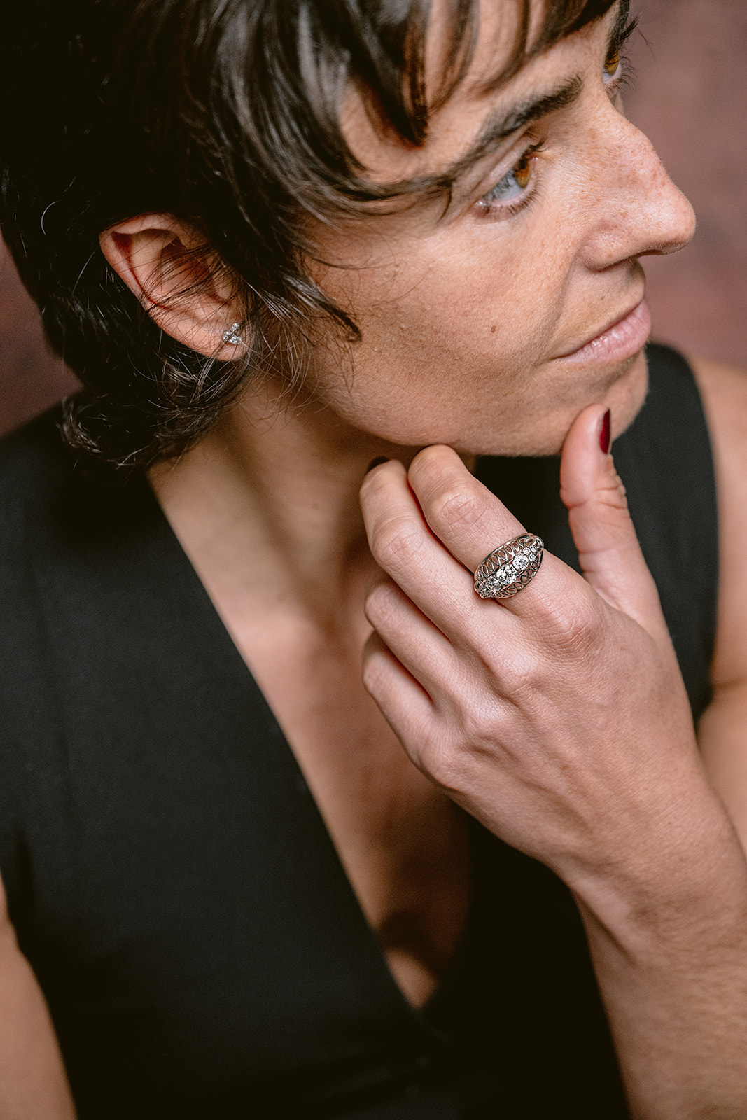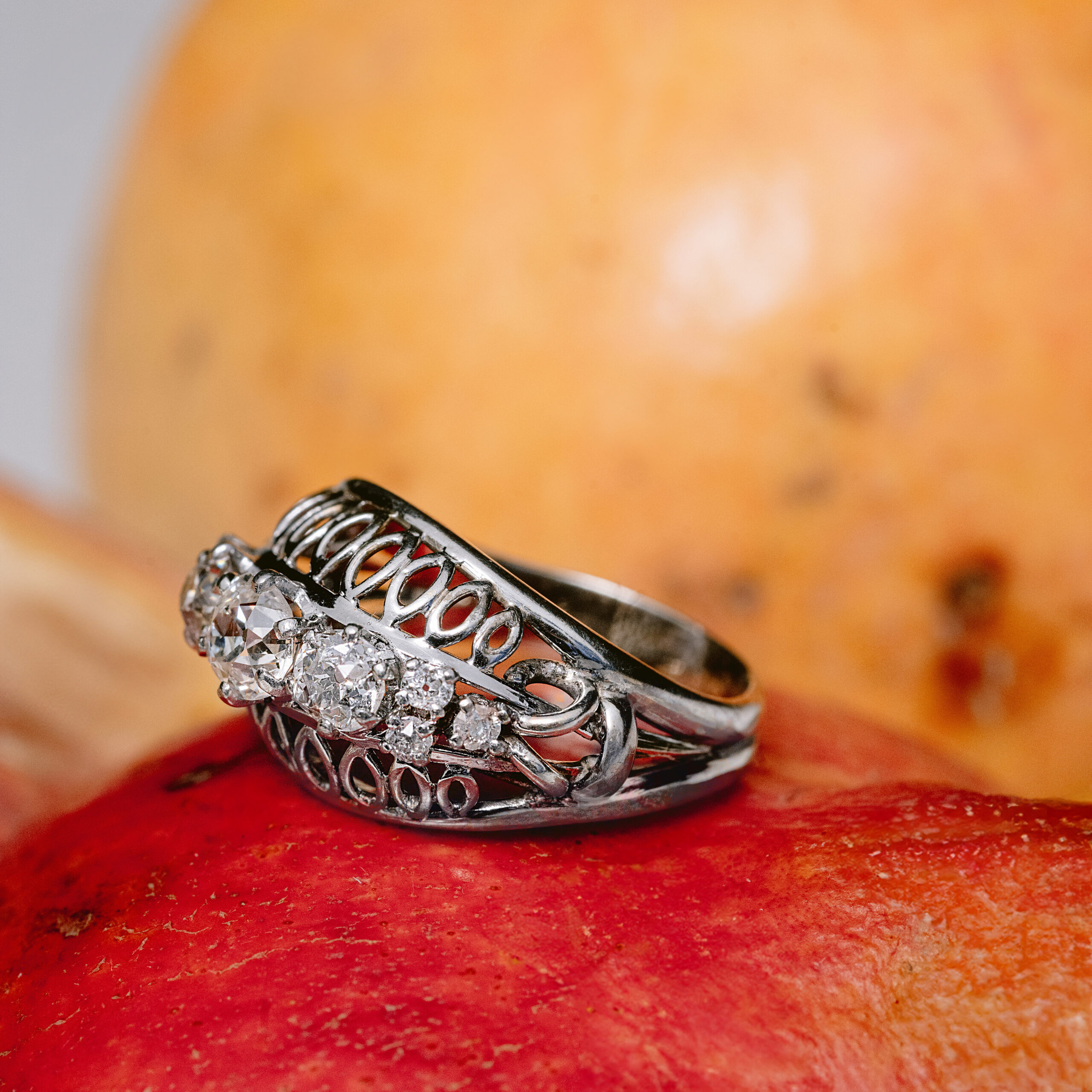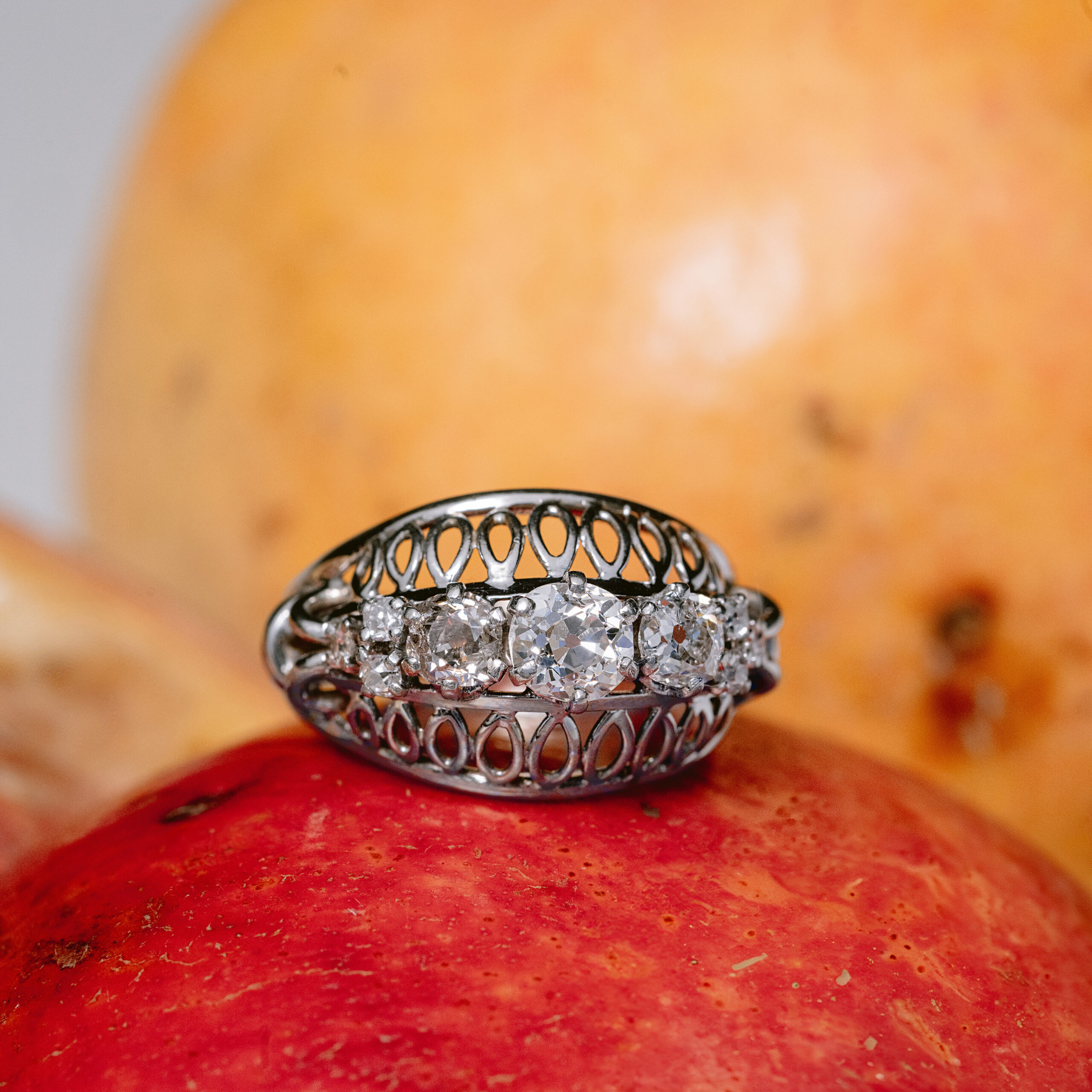 | Materiales | – Platino – Oro 18k – 9 diamantes: 3 centrales talla cojín y antigua y 6 laterales en talla antigua, todos en garras. Totalizan 1,65ct .centrales (0,75ct/J-K/VS–total 0,70ct/G-H/P) .laterales (total 0,20 ct/G-H/P) |