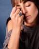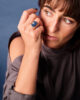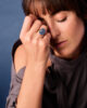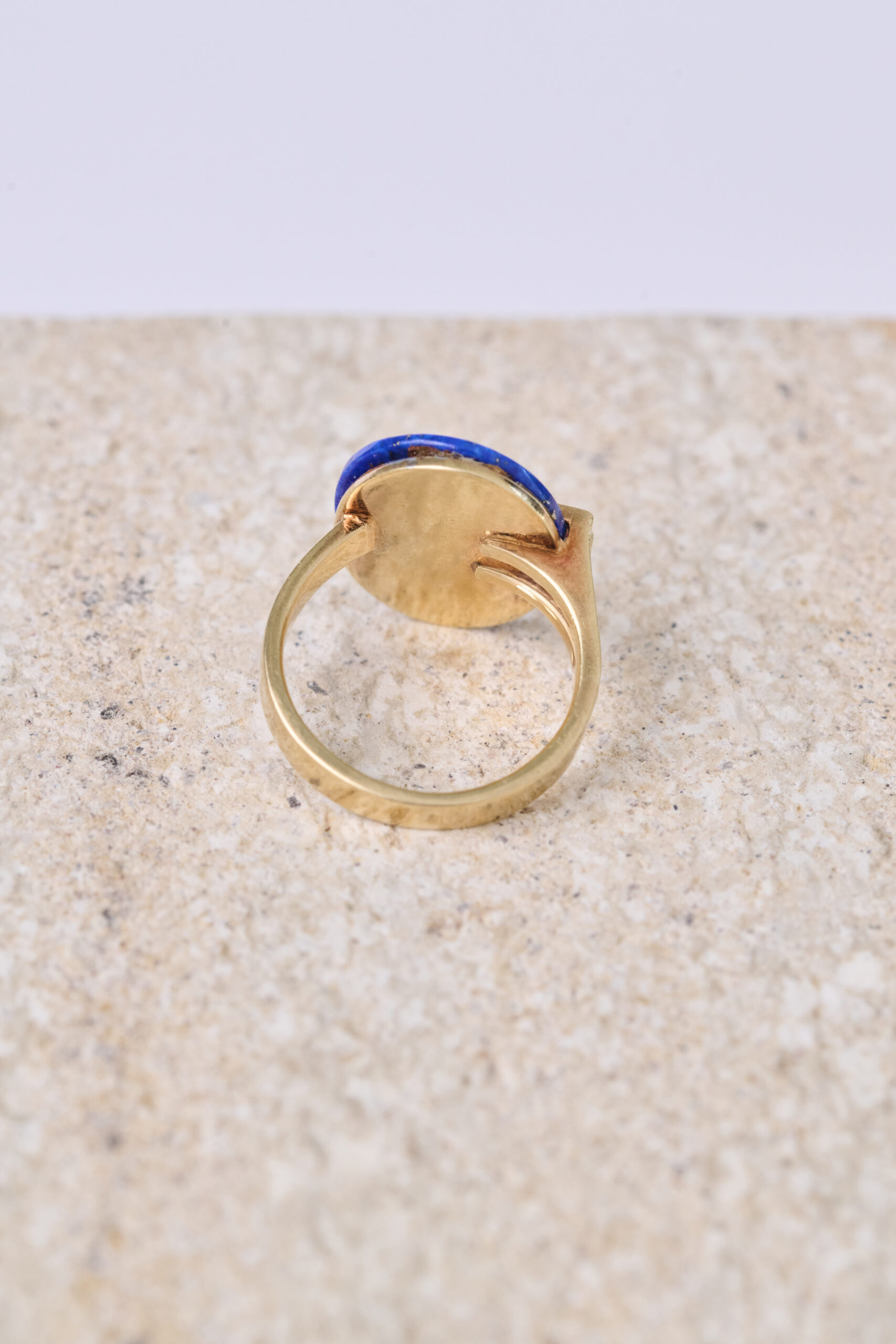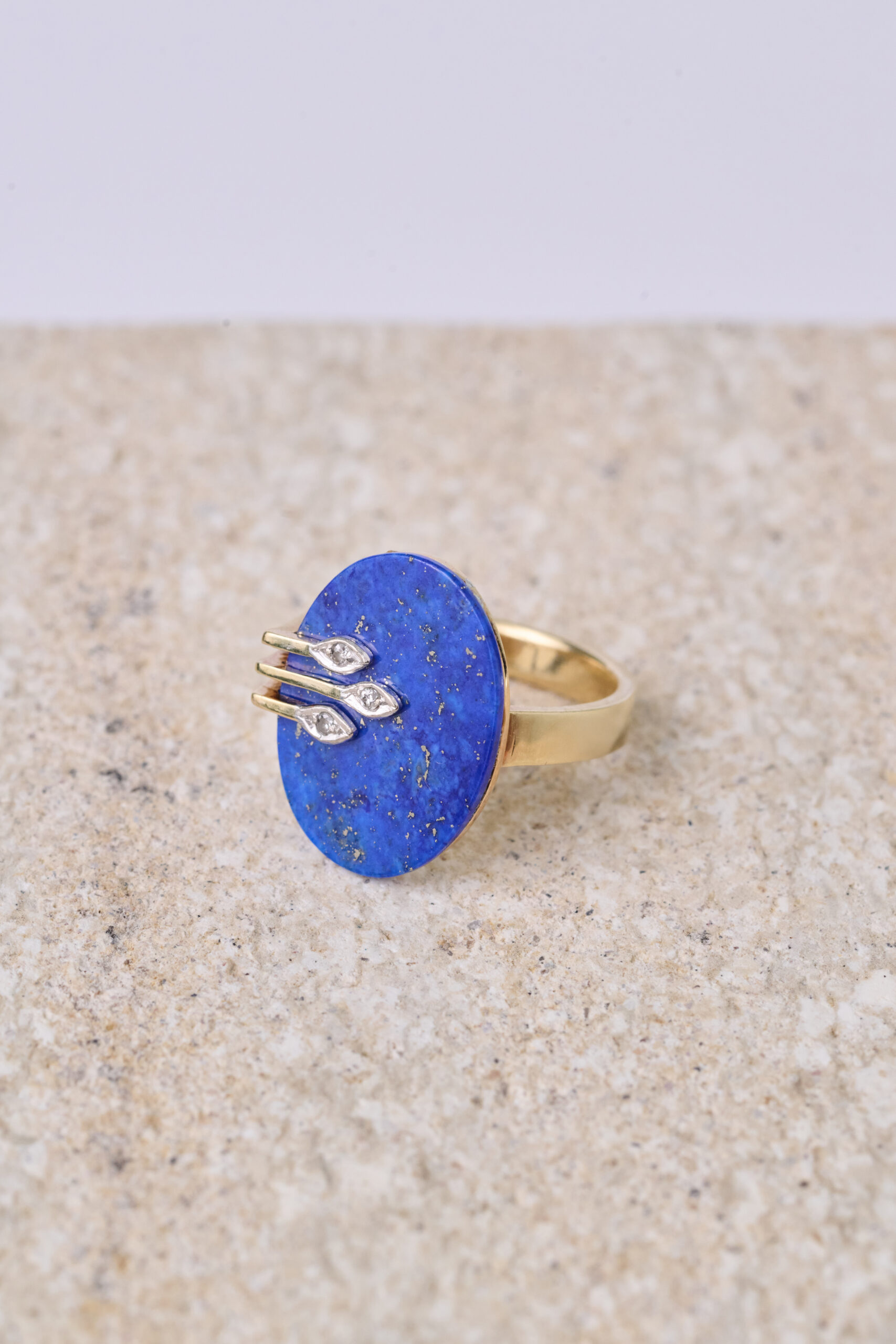 Anillo realizado en oro amarillo 14 quilates, montado con un cabujón circular de lapislázuli de color azul con inclusiones de pirita. La piedra esta engastada en una montura plana y pulida, típica del diseño moderno de mediados del siglo XX. Probablemente de origen Italiano. Sobre la superficie del lapislázuli se disponen tres motivos lineales en oro blanco, cada uno engastado con un pequeño diamante talla antigua.