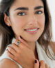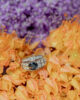 El motivo central está realzado por 12 diamantes talla brillante, dispuestos a ambos lados del zafiro, y complementados por pequeños diamantes talla ocho engastados en pavé que decoran parte del aro. Diseño contemporáneo.