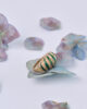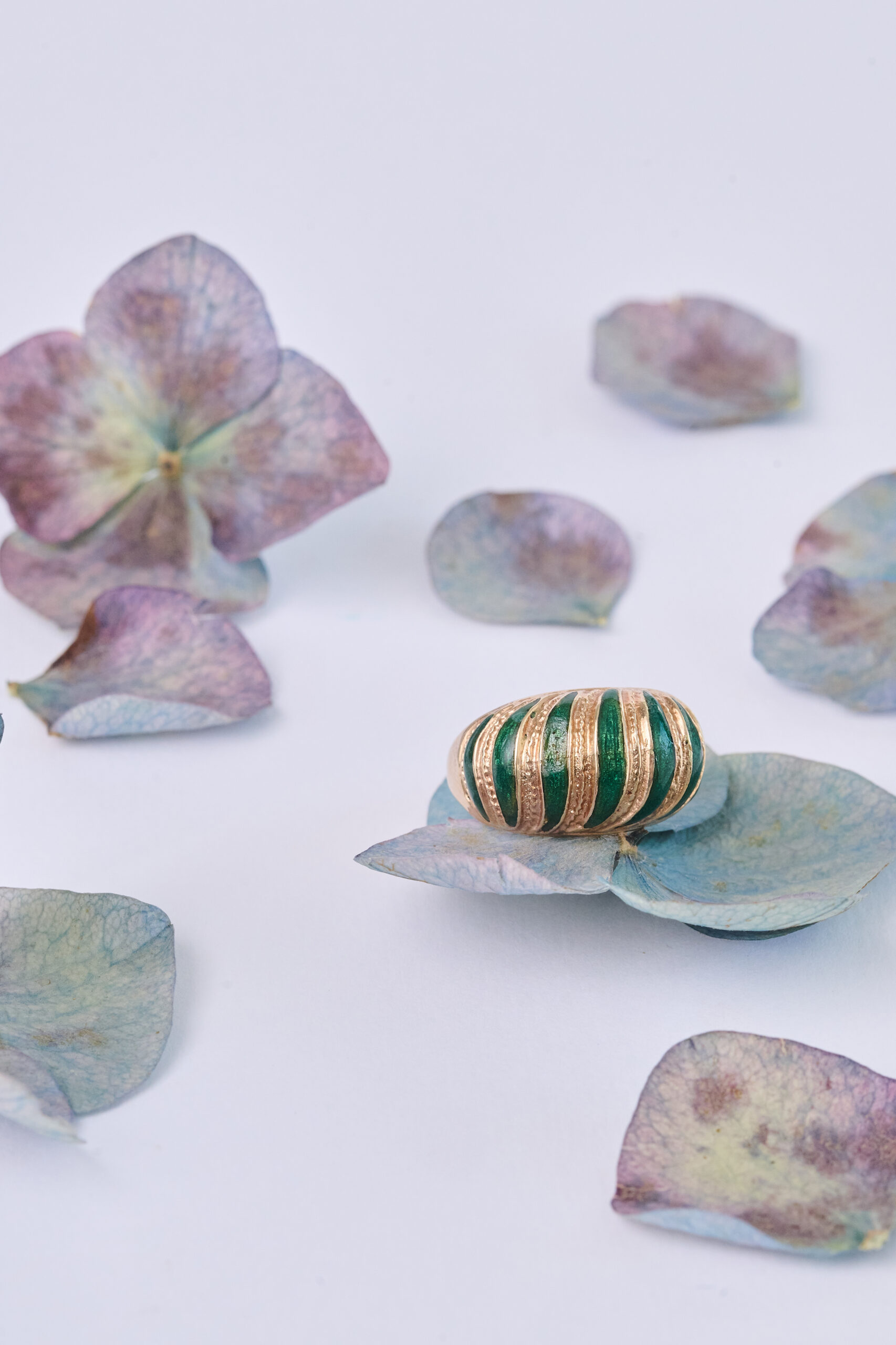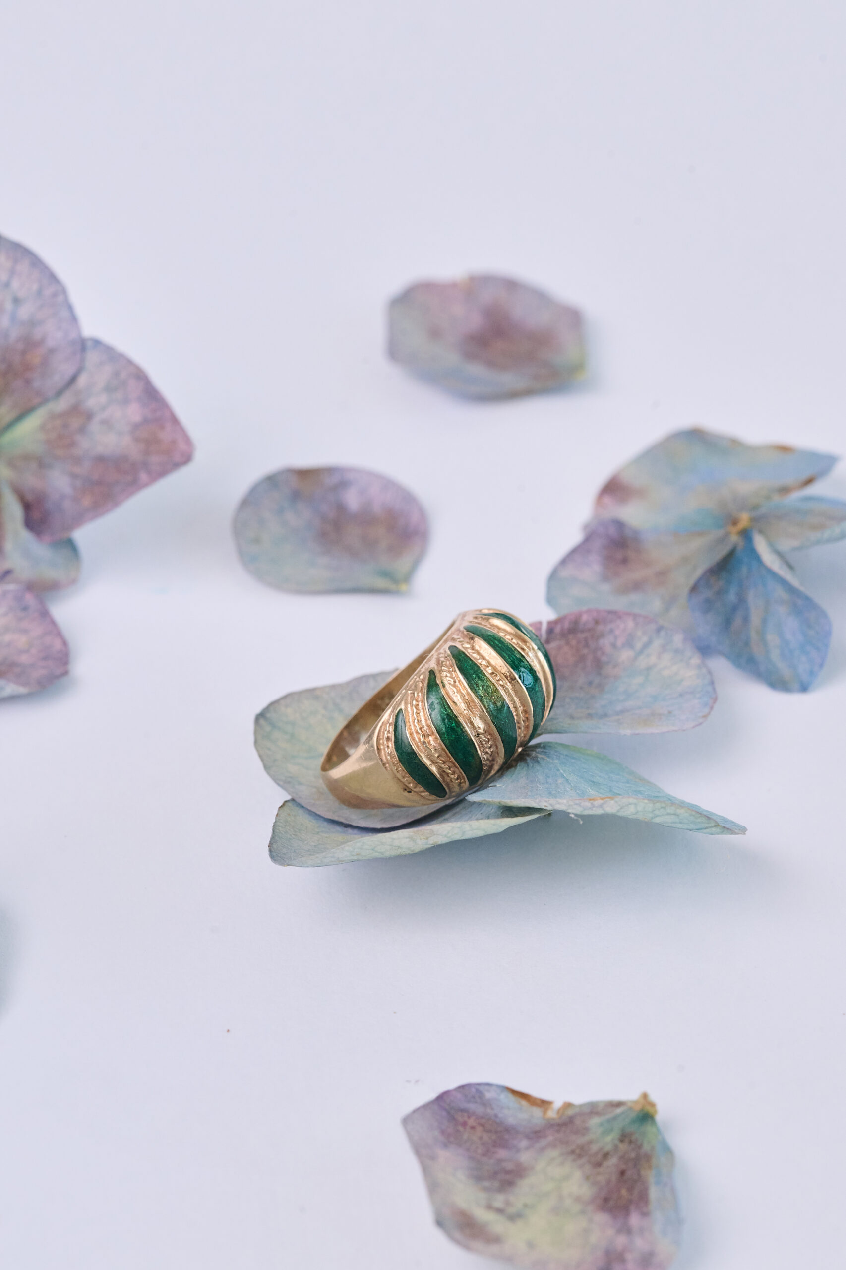 La pieza presenta un diseño bombé típico de las décadas de 1970–1980, con franjas alternadas de esmalte verde y oro texturizado que crean un patrón ondulado. El esmalte verde, profundo y brillante, aporta un carácter retro muy distintivo.