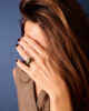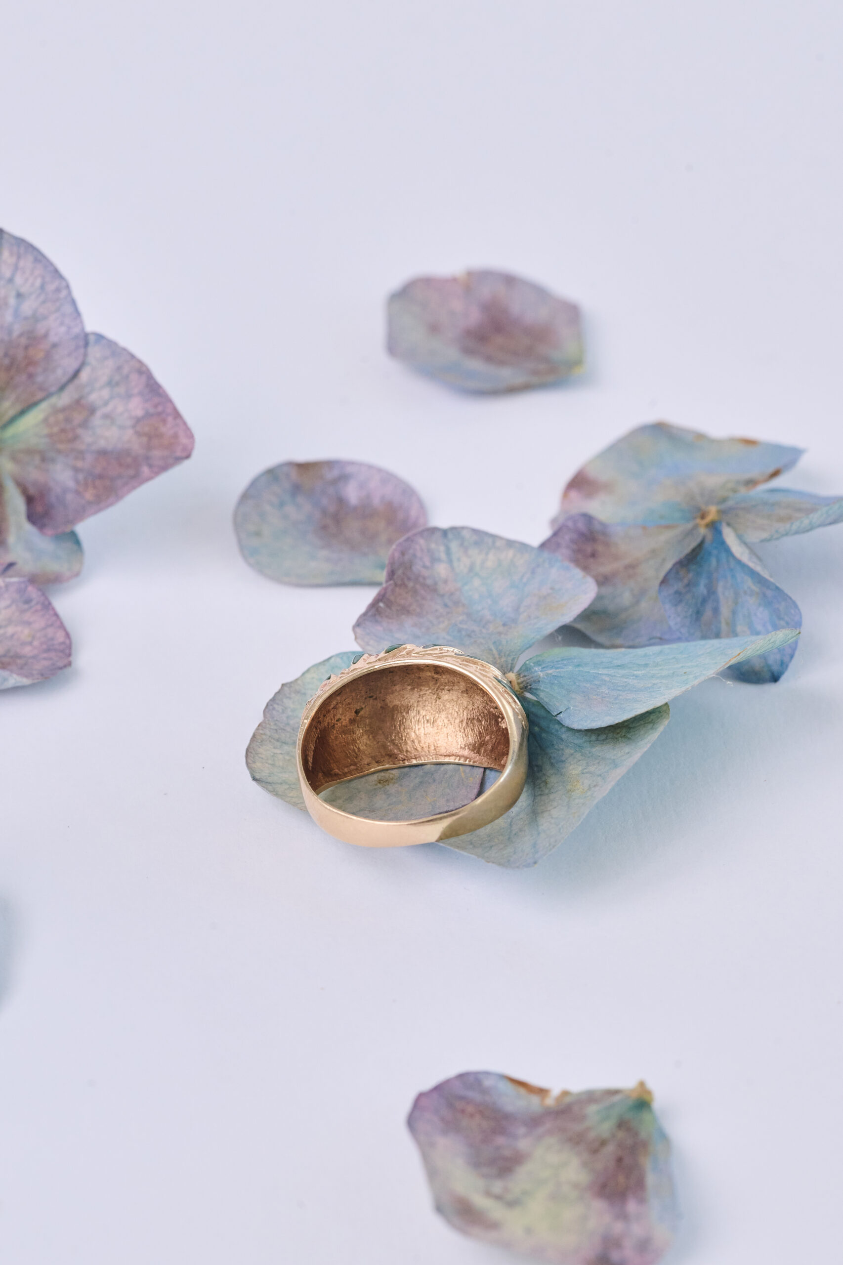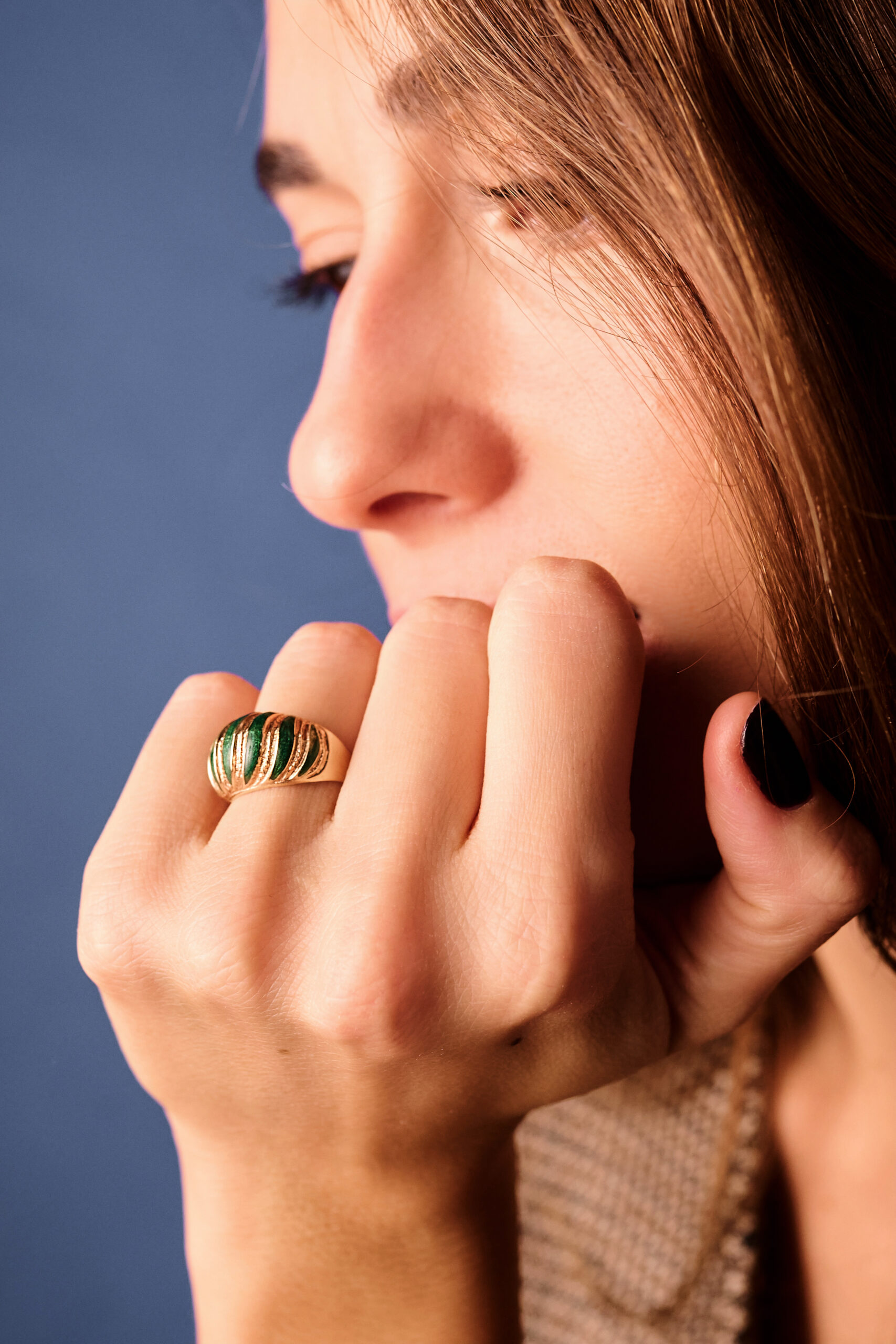 ANILLO VINTAGE BOMBÉ DE ORO AMARILLO 14K LABRADO CON ESMALTE VERDE, FRANCIA 1970/80