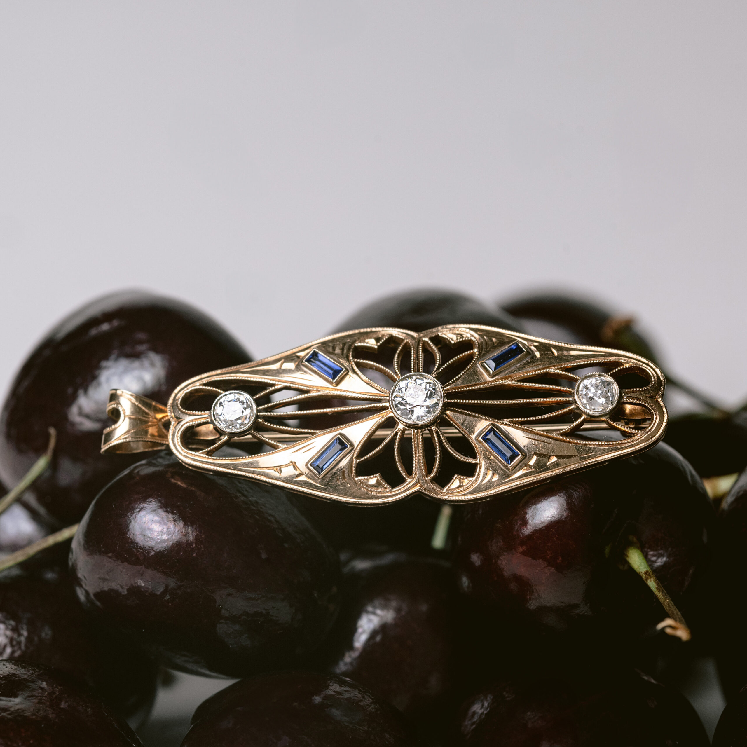 Precioso broche antiguo de oro14k, convertible a colgante, con un precioso y vistoso diseño, formado por un dibujo geométrico adornado con cuatro zafiros verneuil en baguette engastados en bisel milgrain y tres diamantes talla antigua engastados en bisel milgrain.