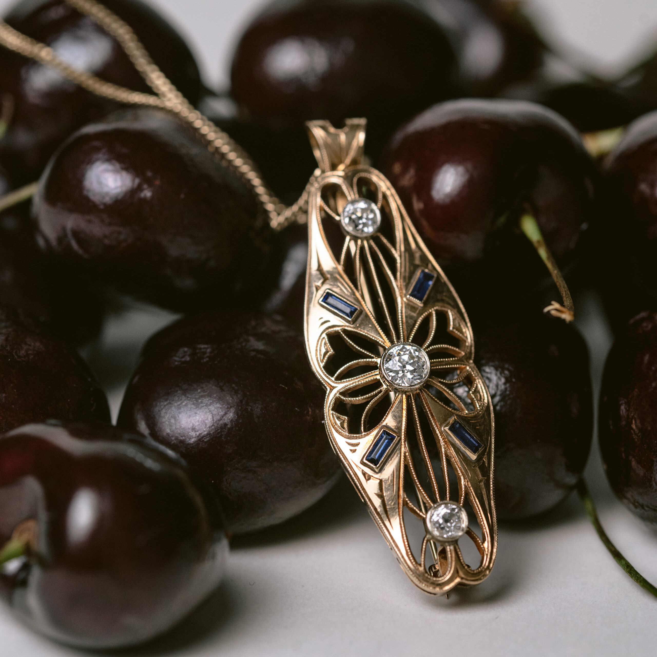 BROCHE-COLGANTE ANTIGUO DE ORO CON DIAMANTES Y ZAFIROS VERNEUIL