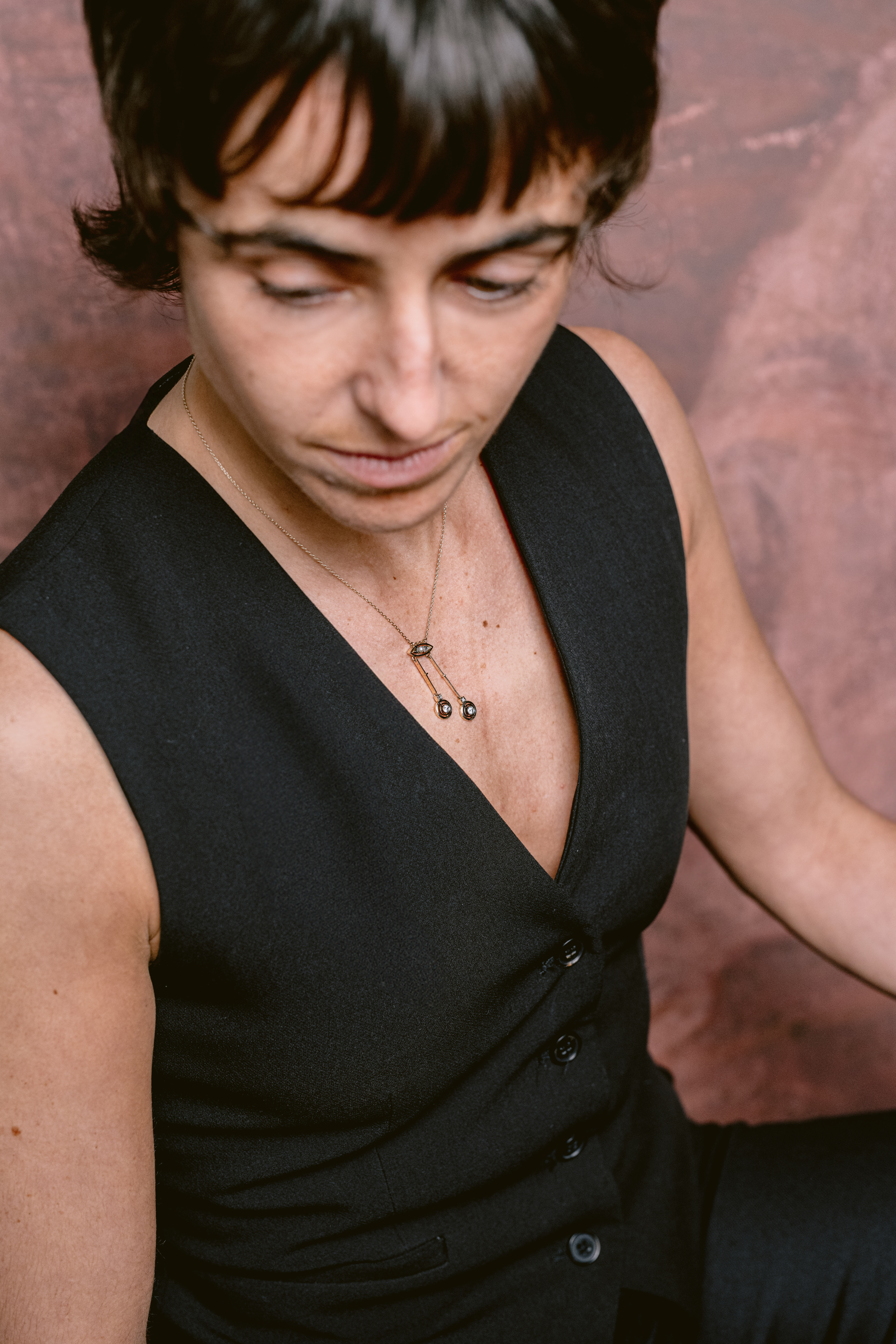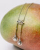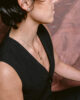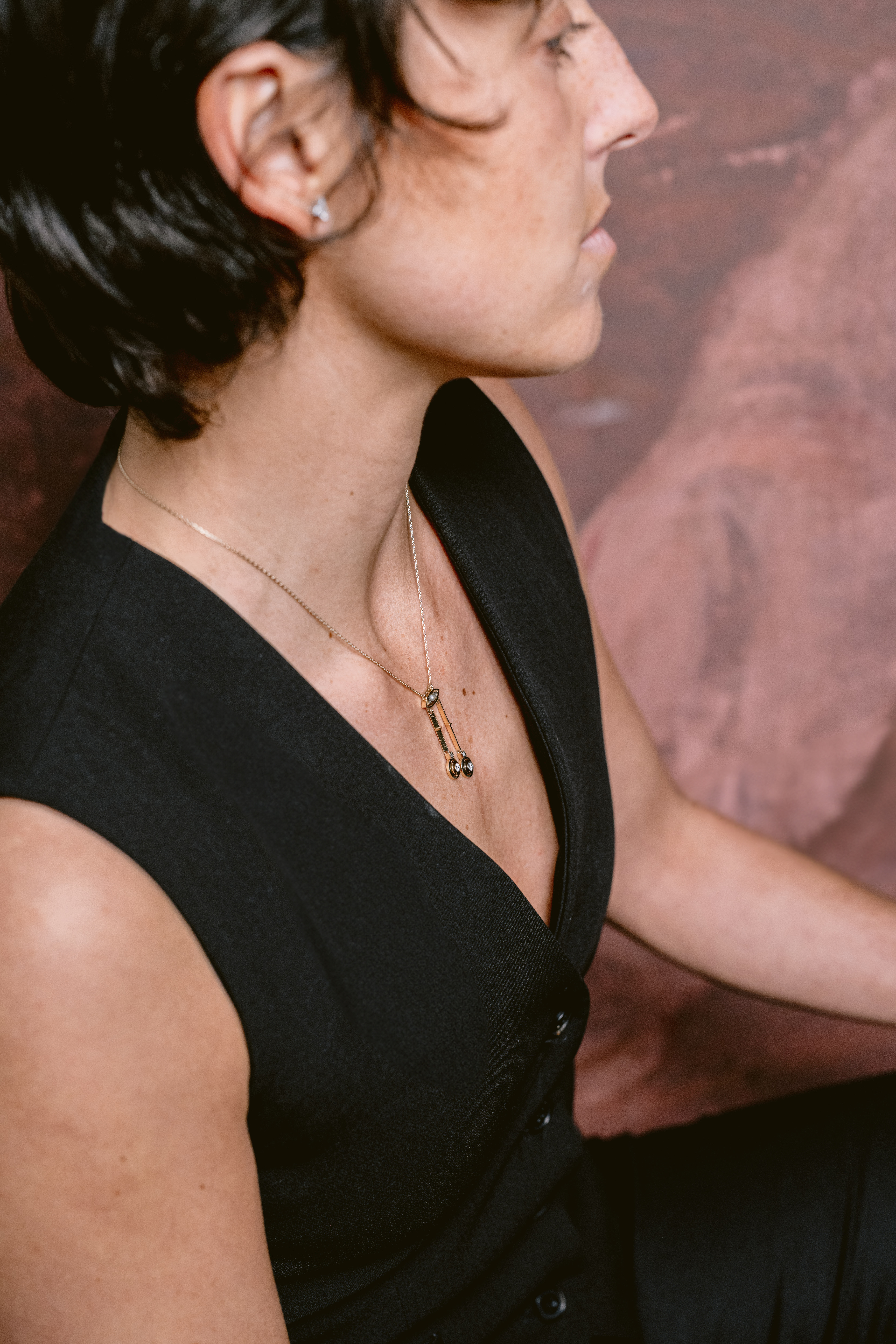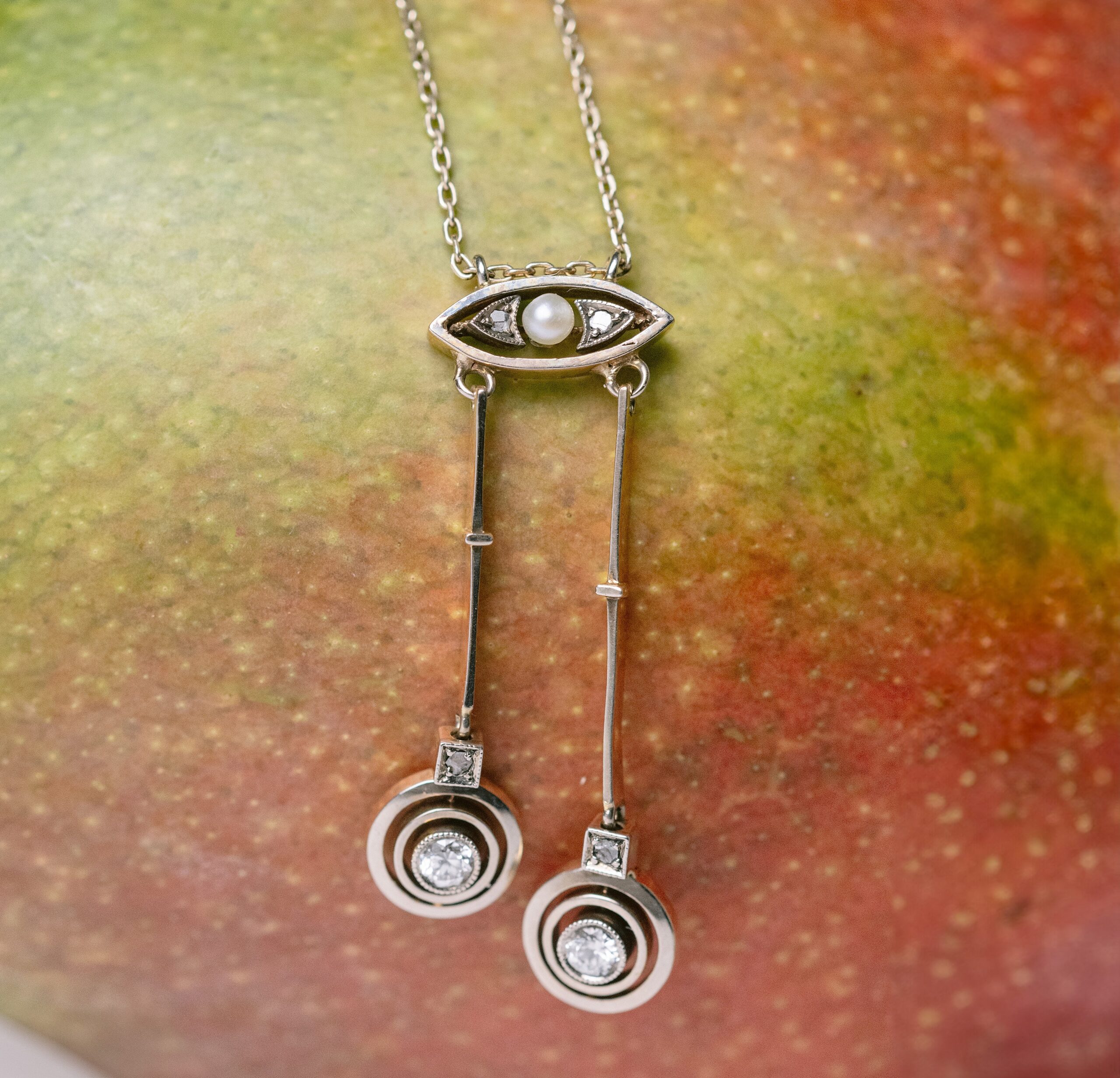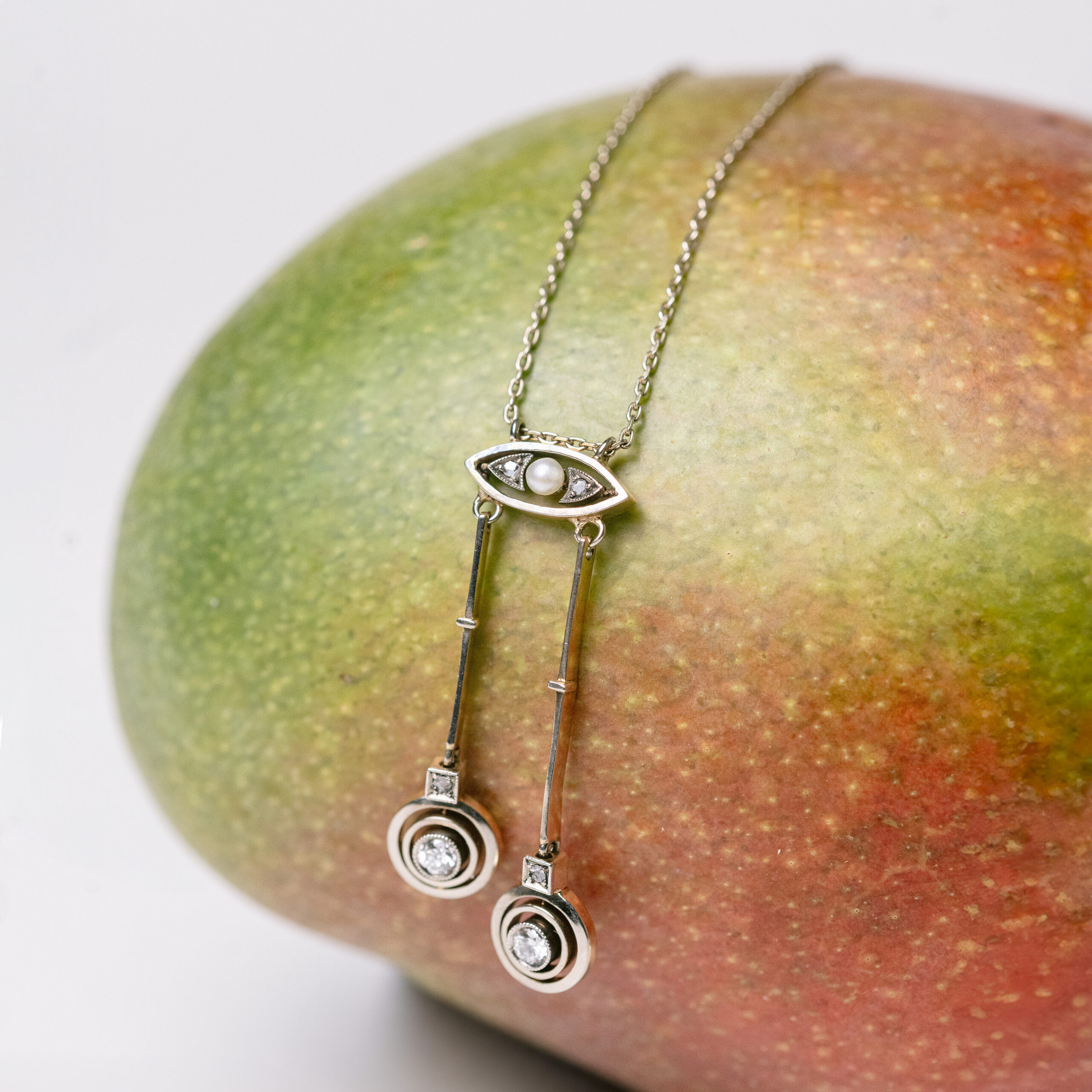 Colgante negligé 1920, de oro 18k compuesto por un pasador engastado con una perla, de donde surge una cadena de oro 585 (posterior) y dos colgantes articulados con diamantes engastados en bisel y pavé.