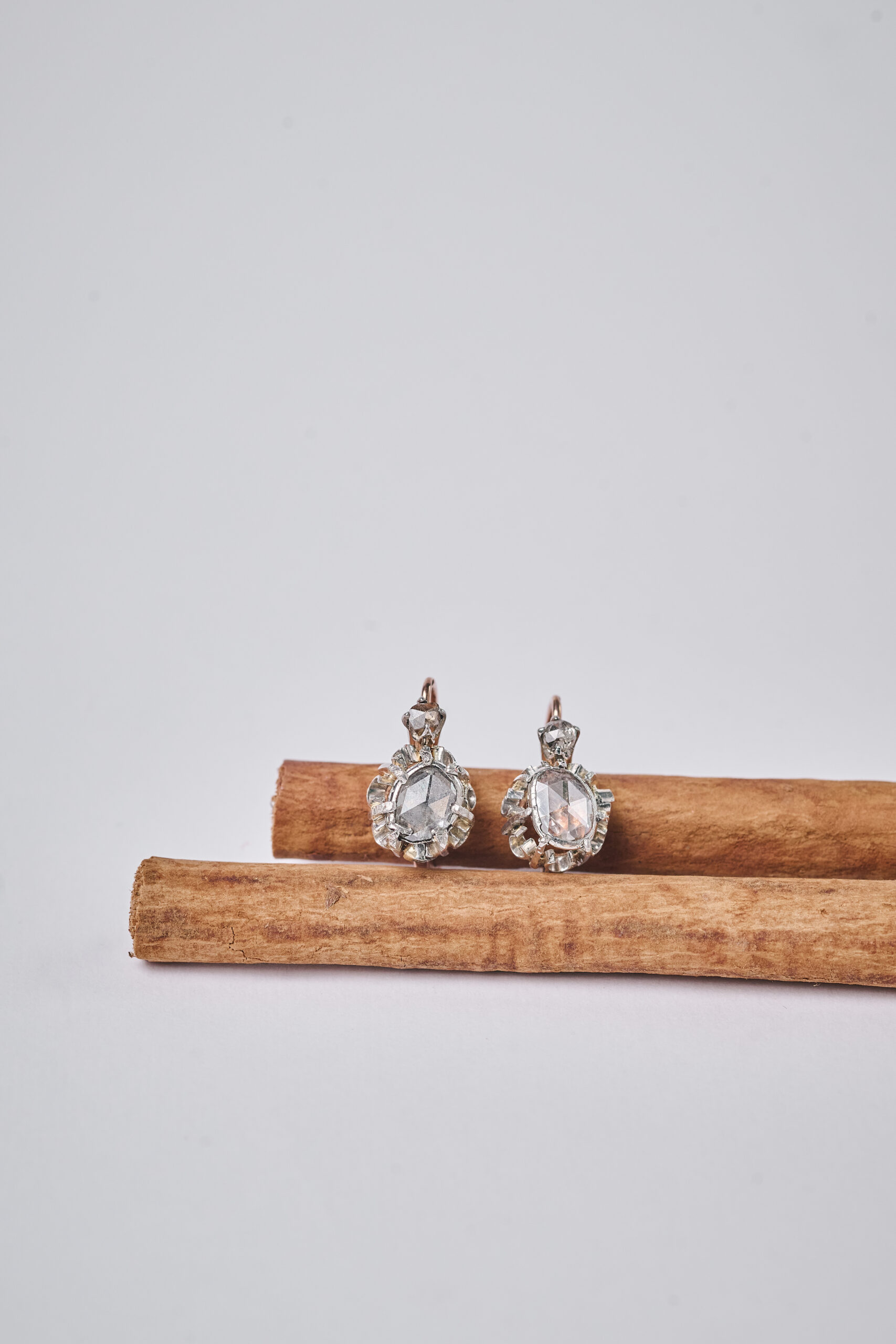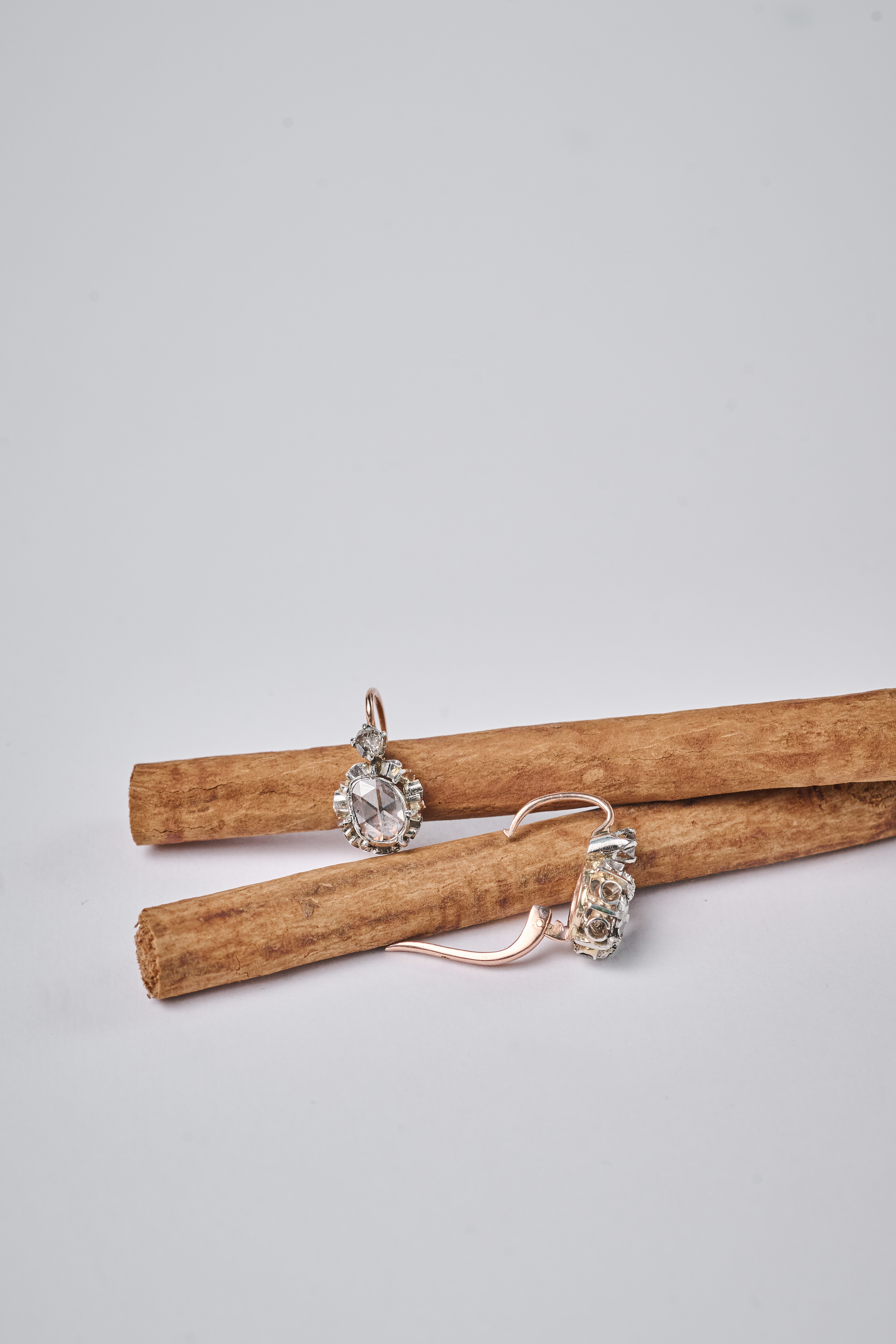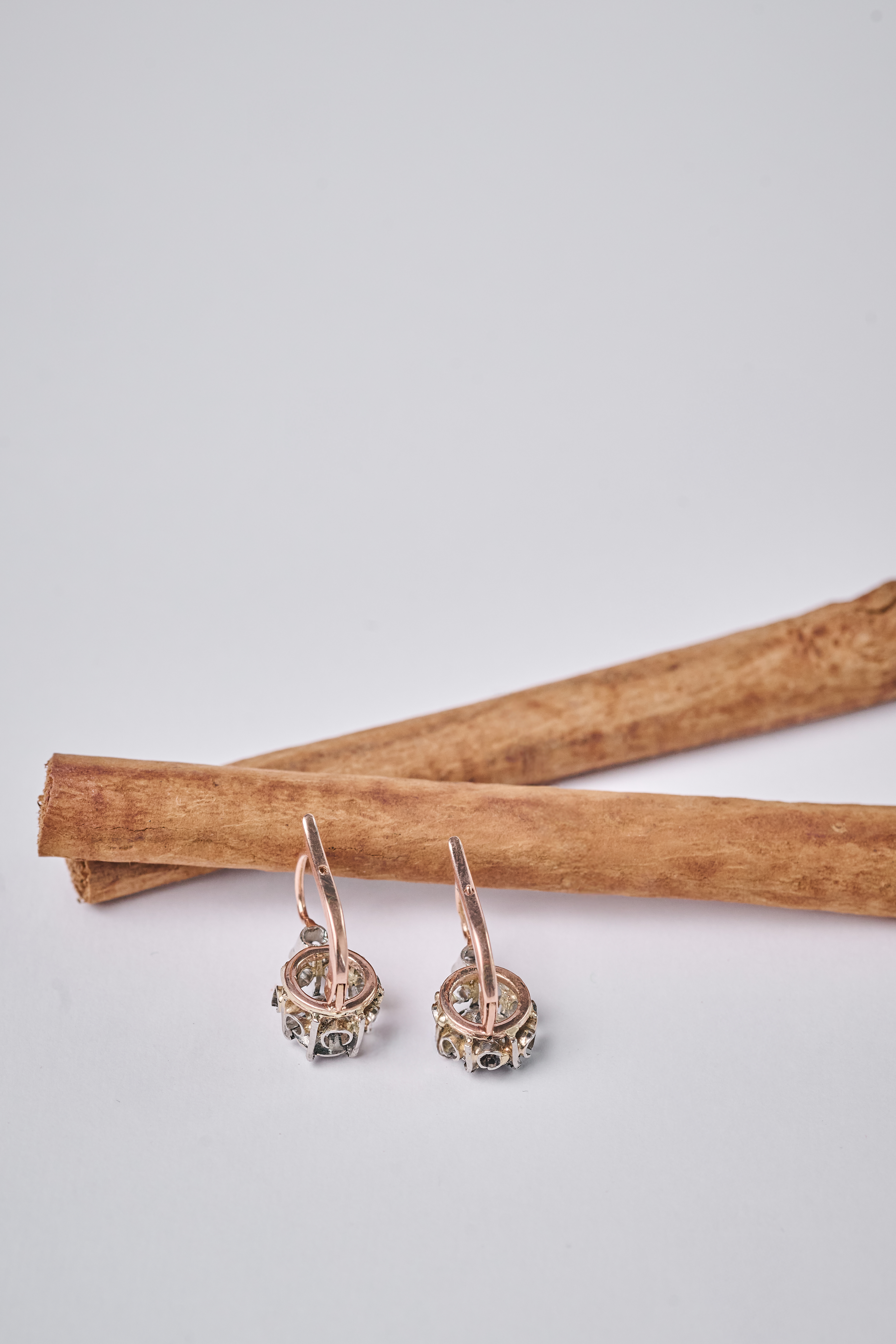Par de pendientes dormilonas de oro rosa de 18k y vistas de platino engastados con diamantes talla rosa y talla rosa coronada