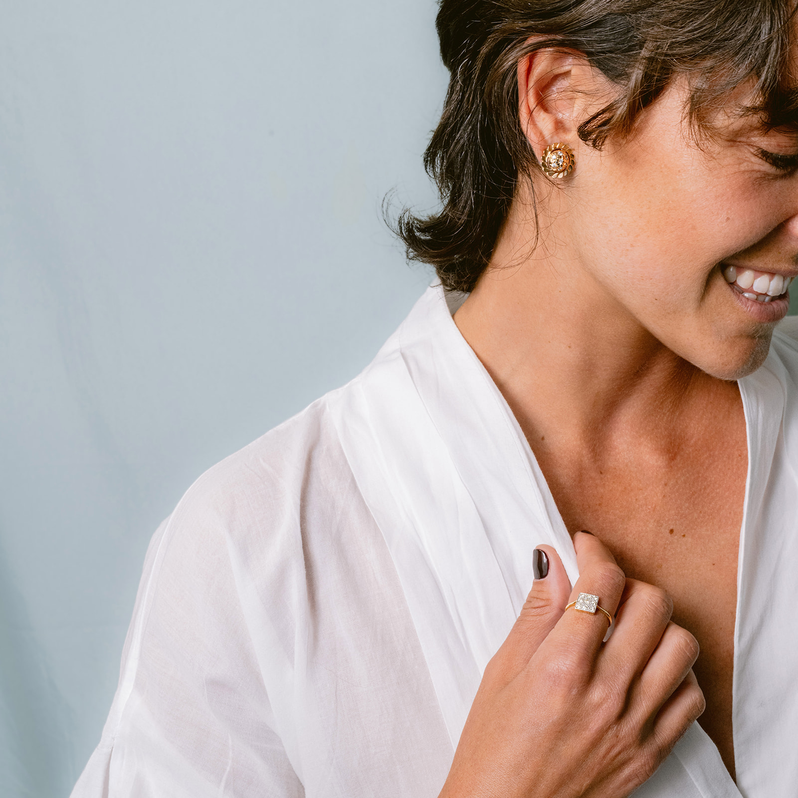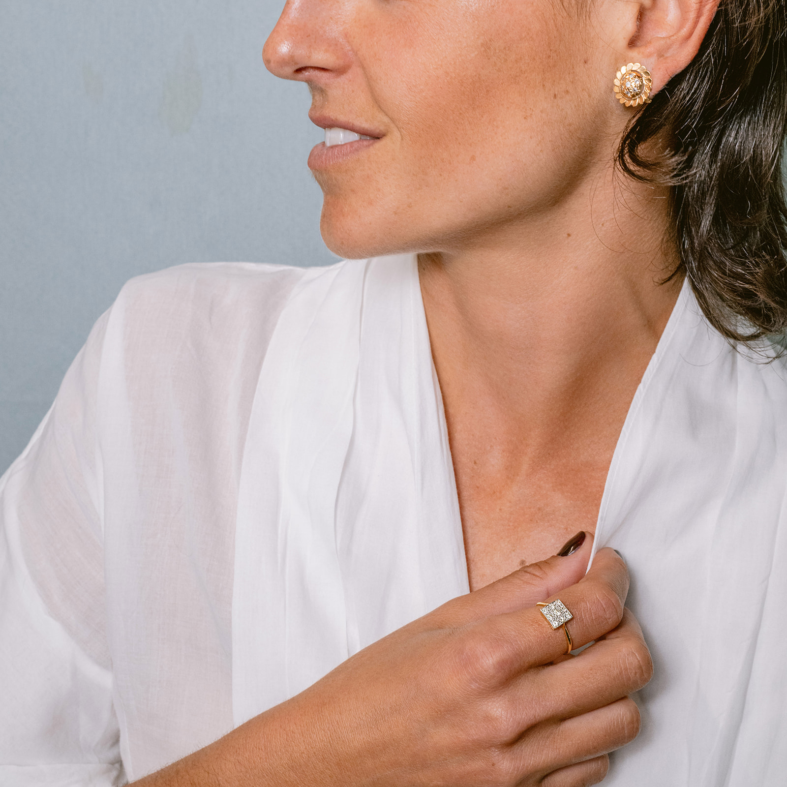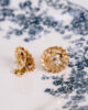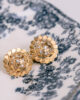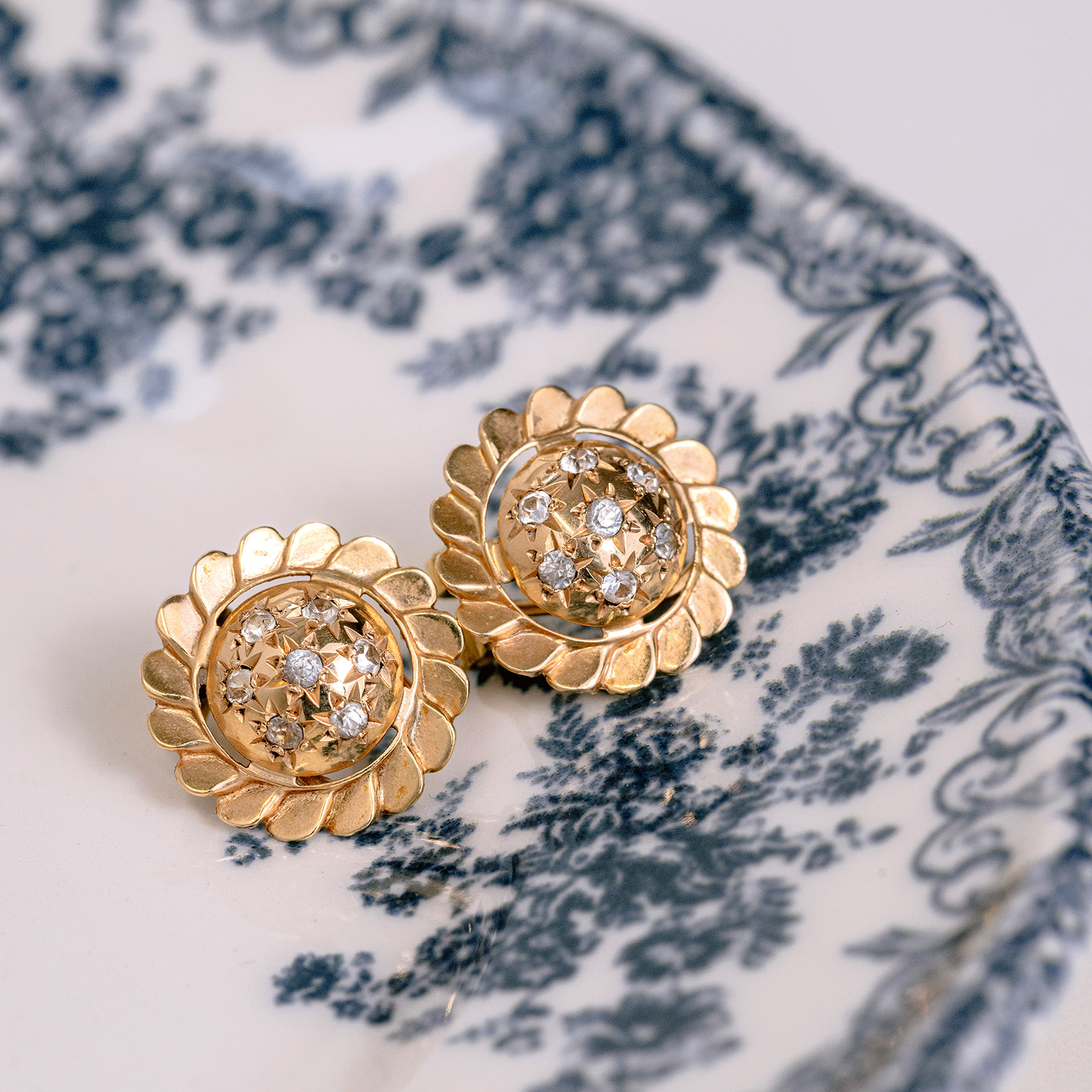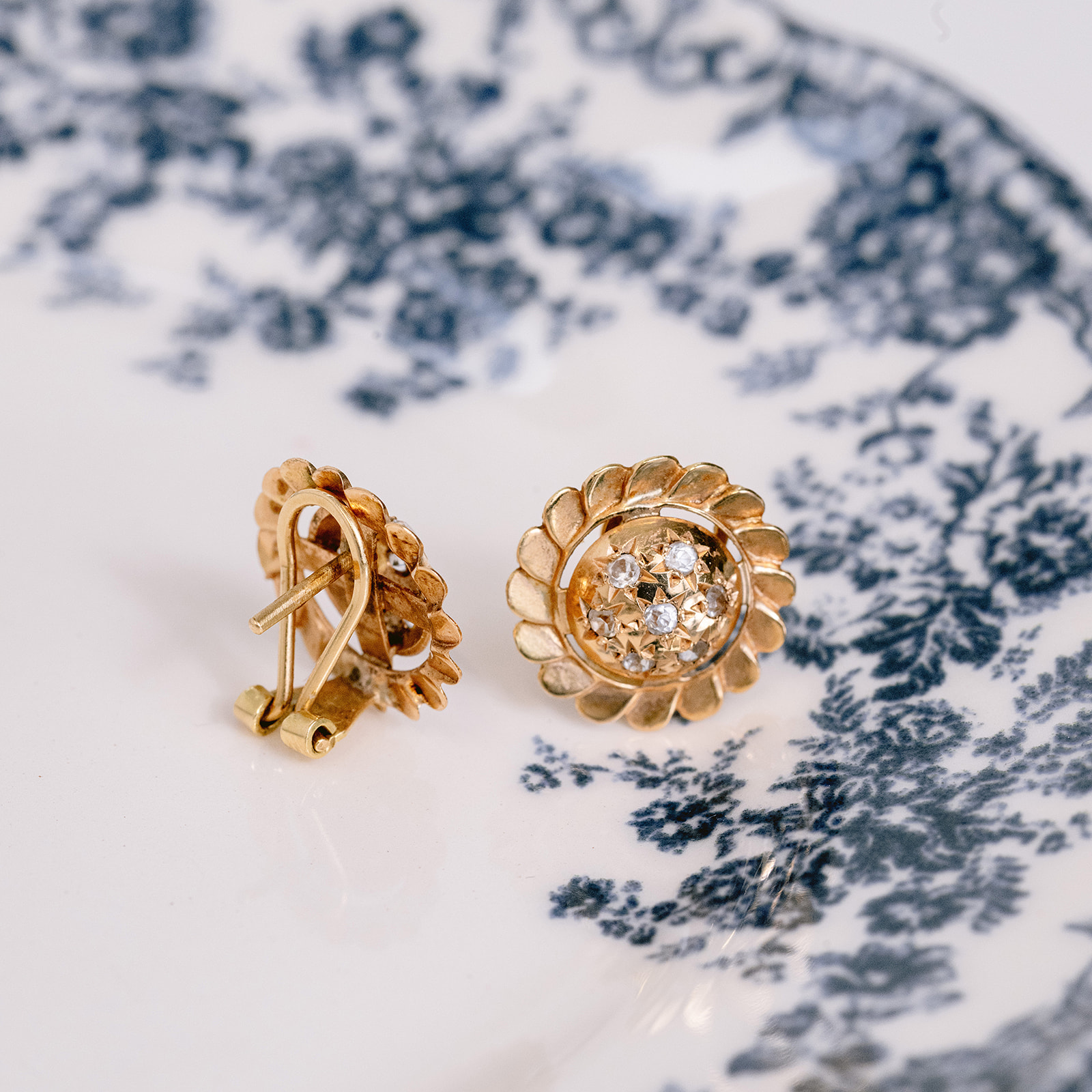 Pendientes vintage con un diseño en forma de flor en oro amarillo 18k, presentan un centro abombado adornado con pequeños zafiros incoloros dispuestos en patrón estelar. Realizados en 1950 en Francia.